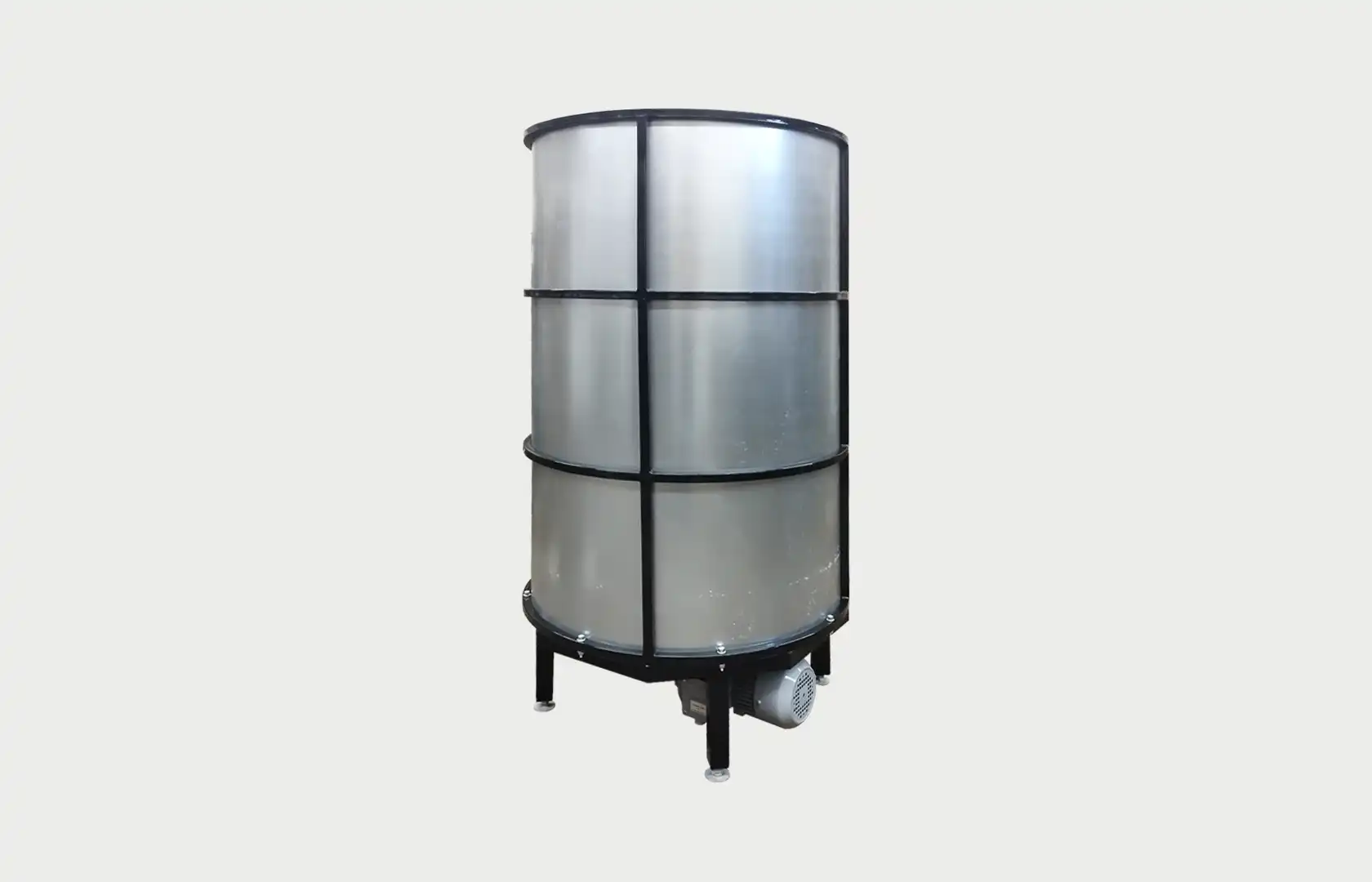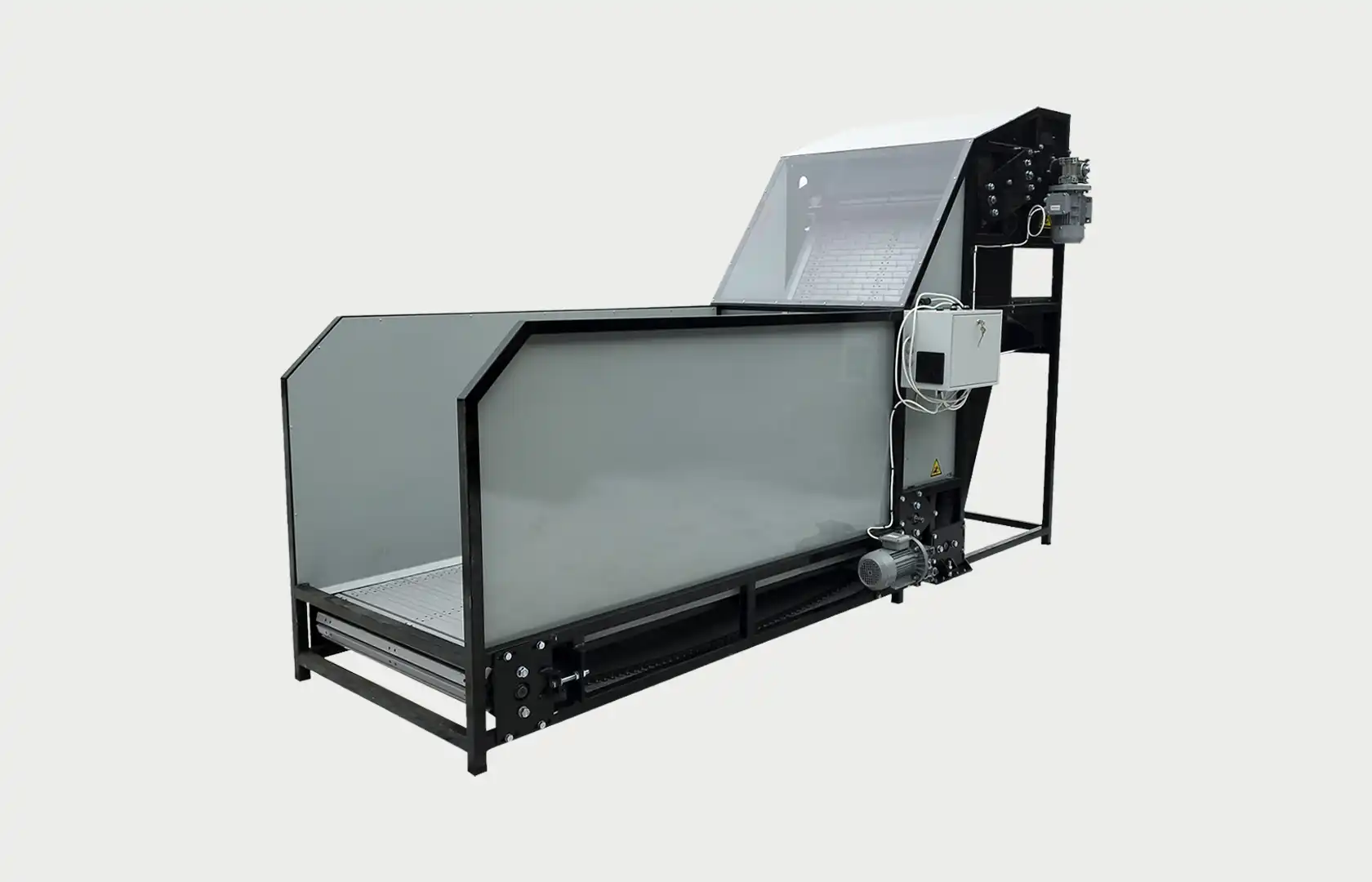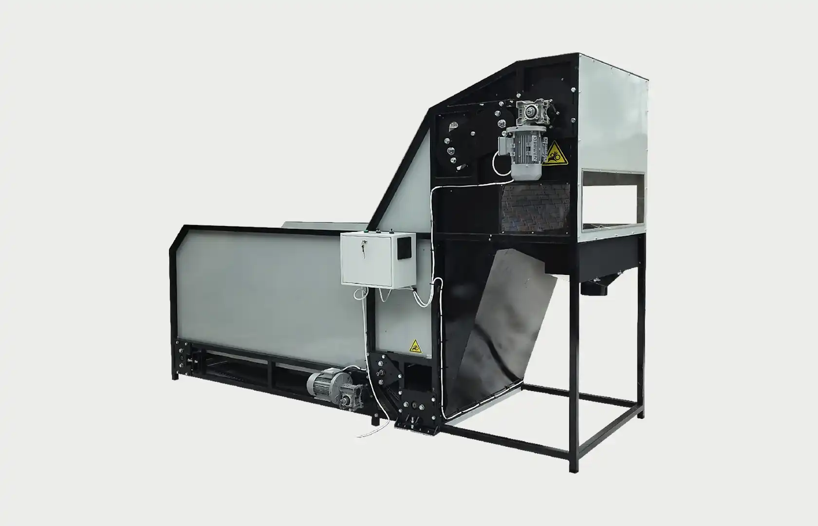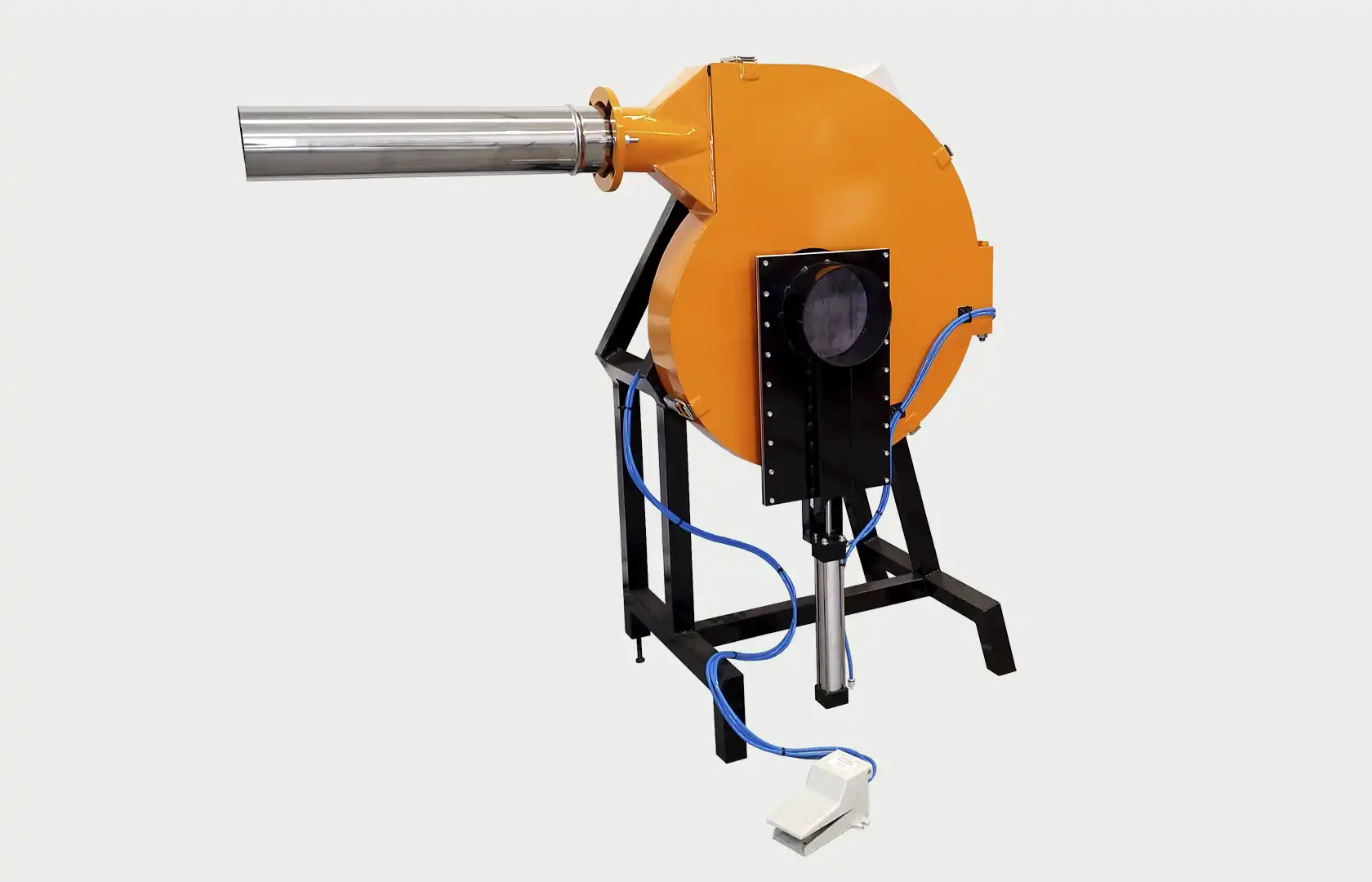 Бункер предназначен для подачи материалов в набивочную машину. Его лопасти расположены горизонтально, что обеспечивает эффективное смешивание различных материалов, таких как пух, перо, синтепон и другие. Бункер оснащен одной или несколькими раздаточными горловинами для подключения набивочных устройств.