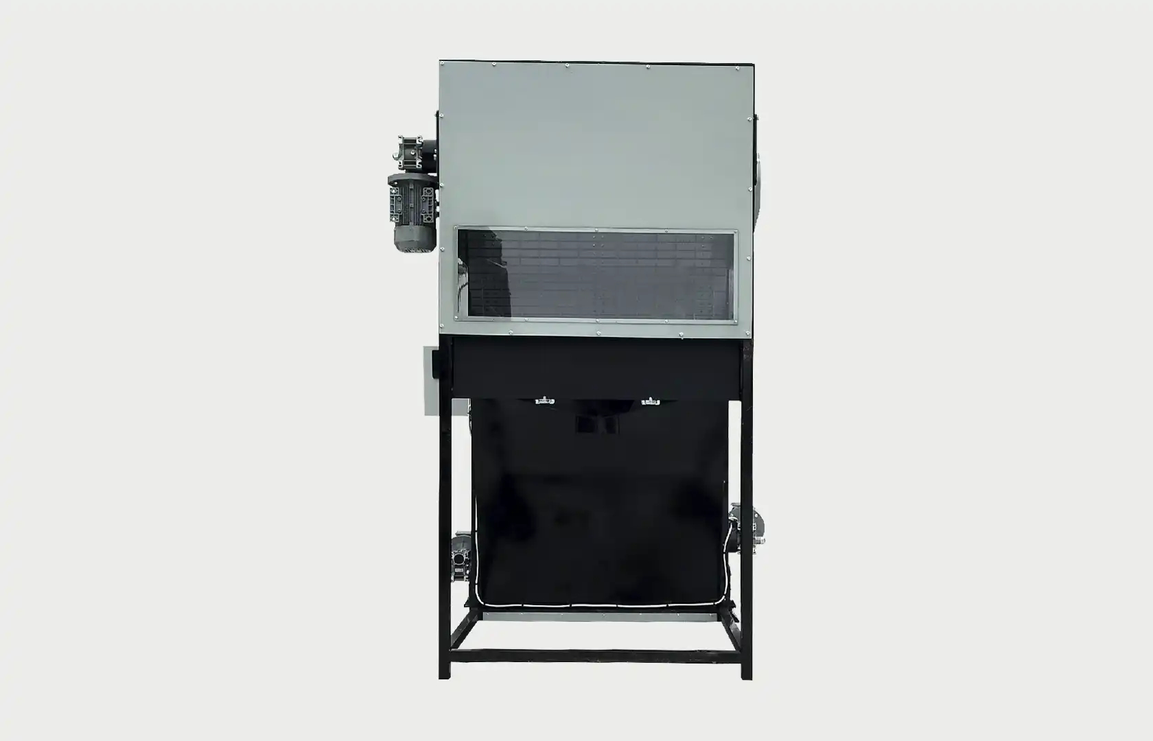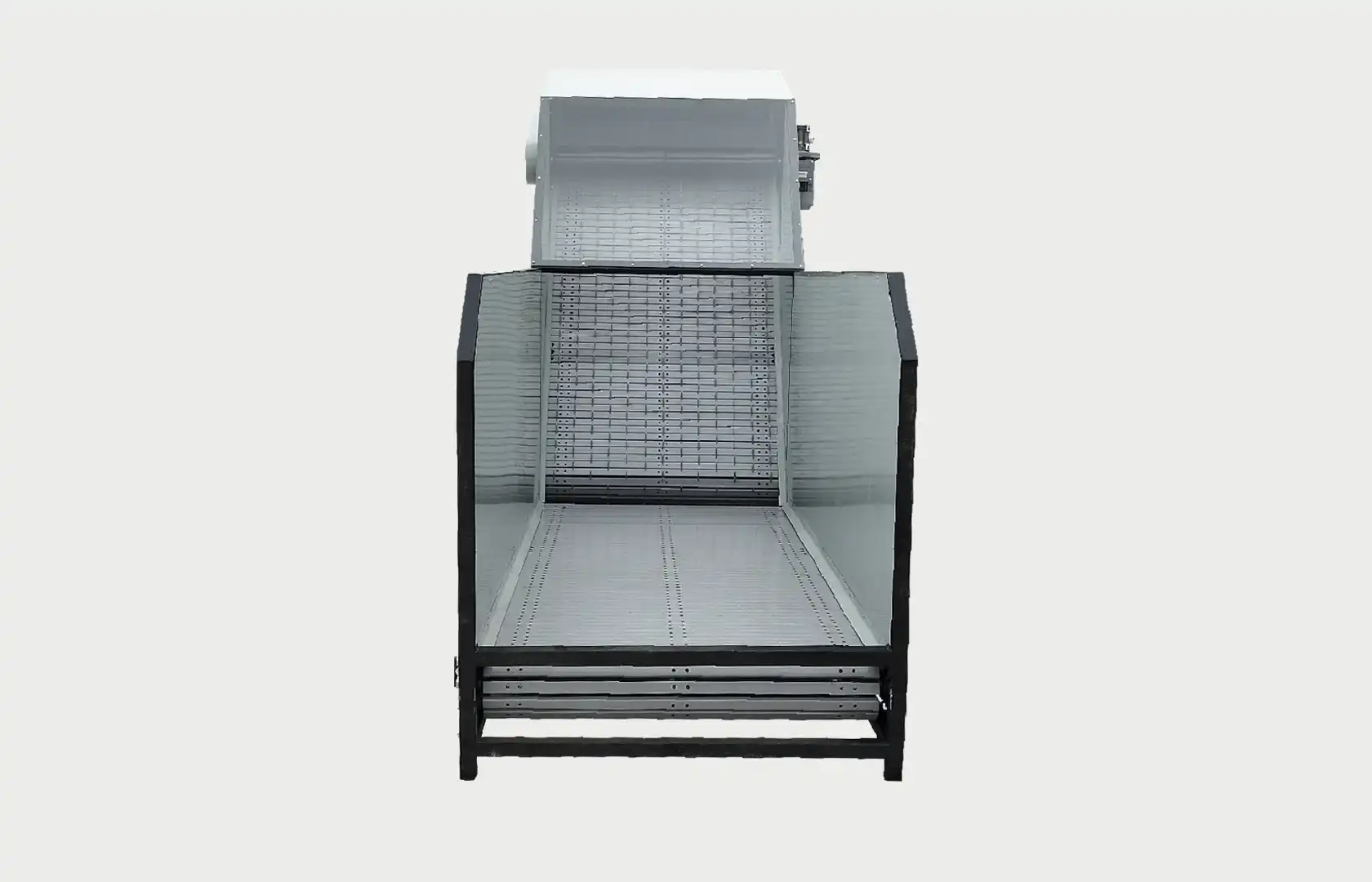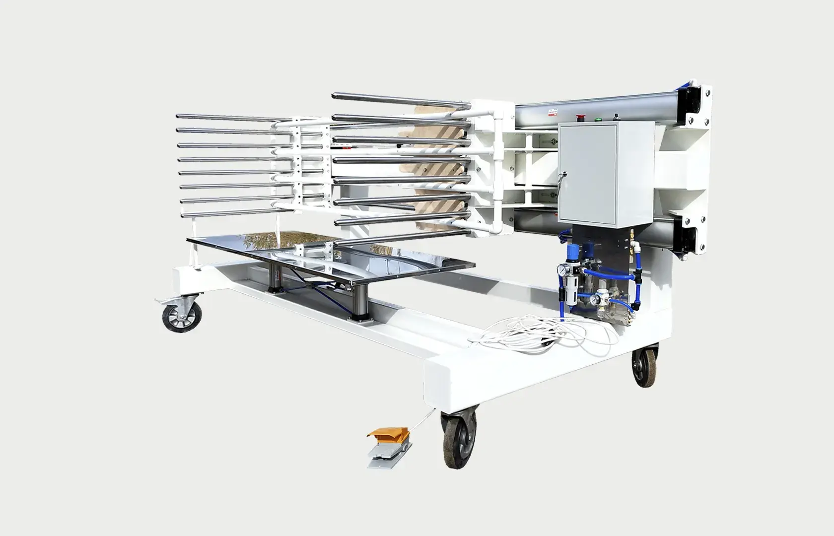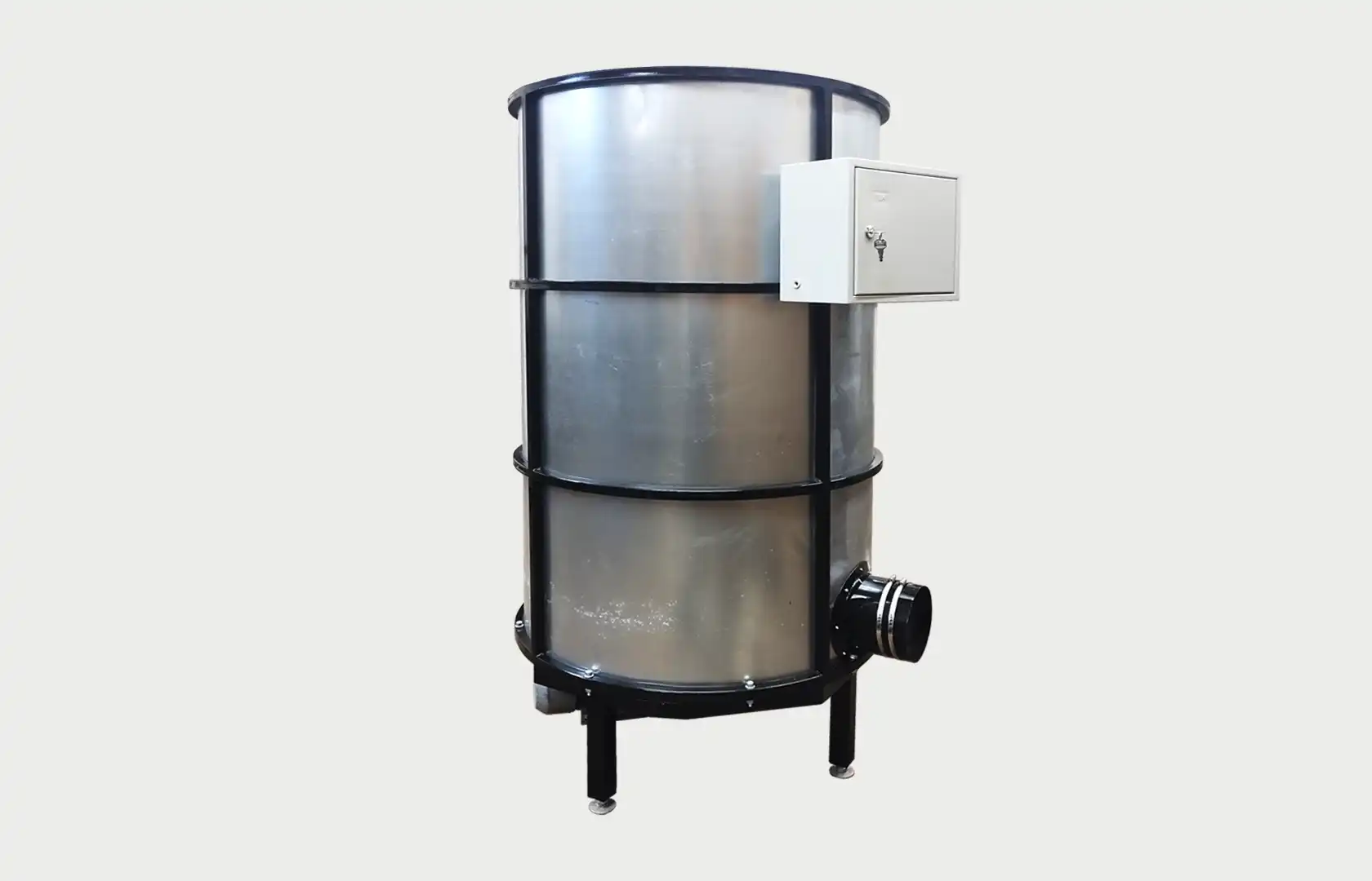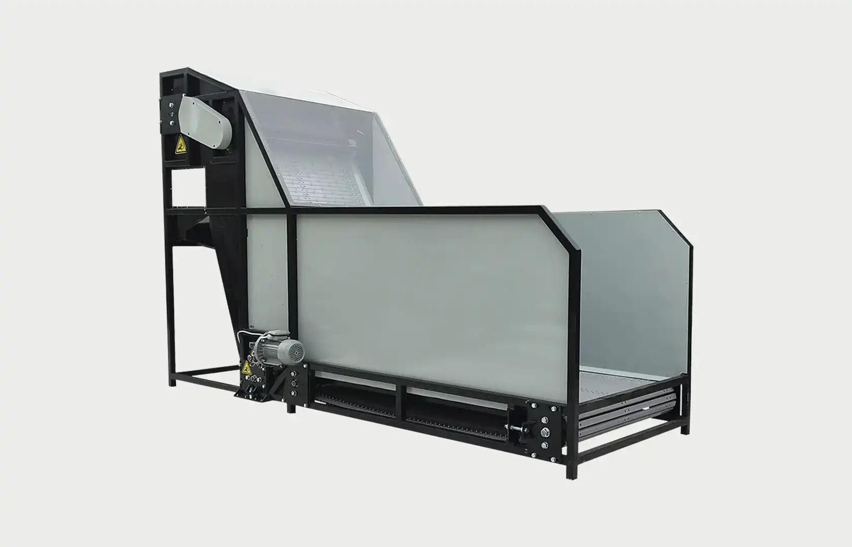 Бункер предназначен для подачи материалов в набивочную машину. Его лопасти расположены горизонтально, что обеспечивает эффективное смешивание различных материалов, таких как пух, перо, синтепон и другие. Бункер оснащен одной или несколькими раздаточными горловинами для подключения набивочных устройств.